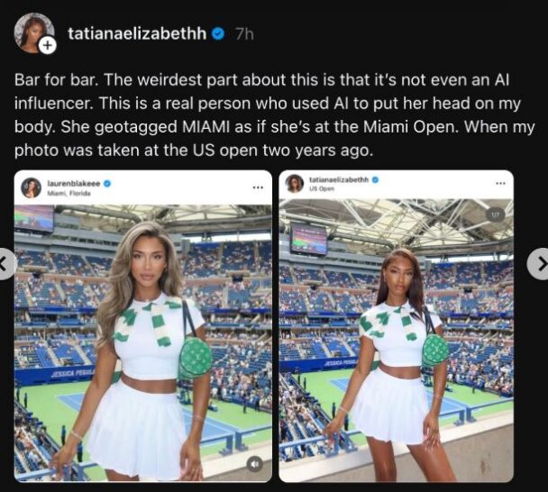 A model posted that another influencer allegedly used AI to swap her head onto the model’s own body, then geotagged it as Miami like she was serving courtside glam at the Open last weekend.